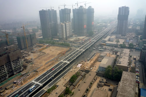 | 和平路是石家莊市北翼東西向的一條城市主干道,是石家莊市總體規(guī)劃中的“四橫”之一。和平路跨線橋(紅軍街——棉一立交橋)工程始于紅軍大街,跨越中華大街、九中街、北新街、車輛廠前街、京廣線、勝利大街、平安大街、長征街后與棉一立交橋連接,高架橋全長3616米。 由我公司承建的一標(biāo)段西起紅軍大街,東止于北新街東220米,總長1621.267m,由高架橋梁、道路、排水管道、道路照明等工程項目組成,是全線三個標(biāo)段中工程量最大的標(biāo)段。2009年4月30日主橋主路正式通車,比預(yù)定工期提前了10個月。 “和平路跨線橋工程的建成通車,標(biāo)志著省會城市基礎(chǔ)設(shè)施建設(shè)翻開嶄新的一頁,對完善市區(qū)路網(wǎng)結(jié)構(gòu)和改善市民出行環(huán)境、進一步改善城市面貌意義重大!---燕趙晚報 2009年5月1日 頭版
